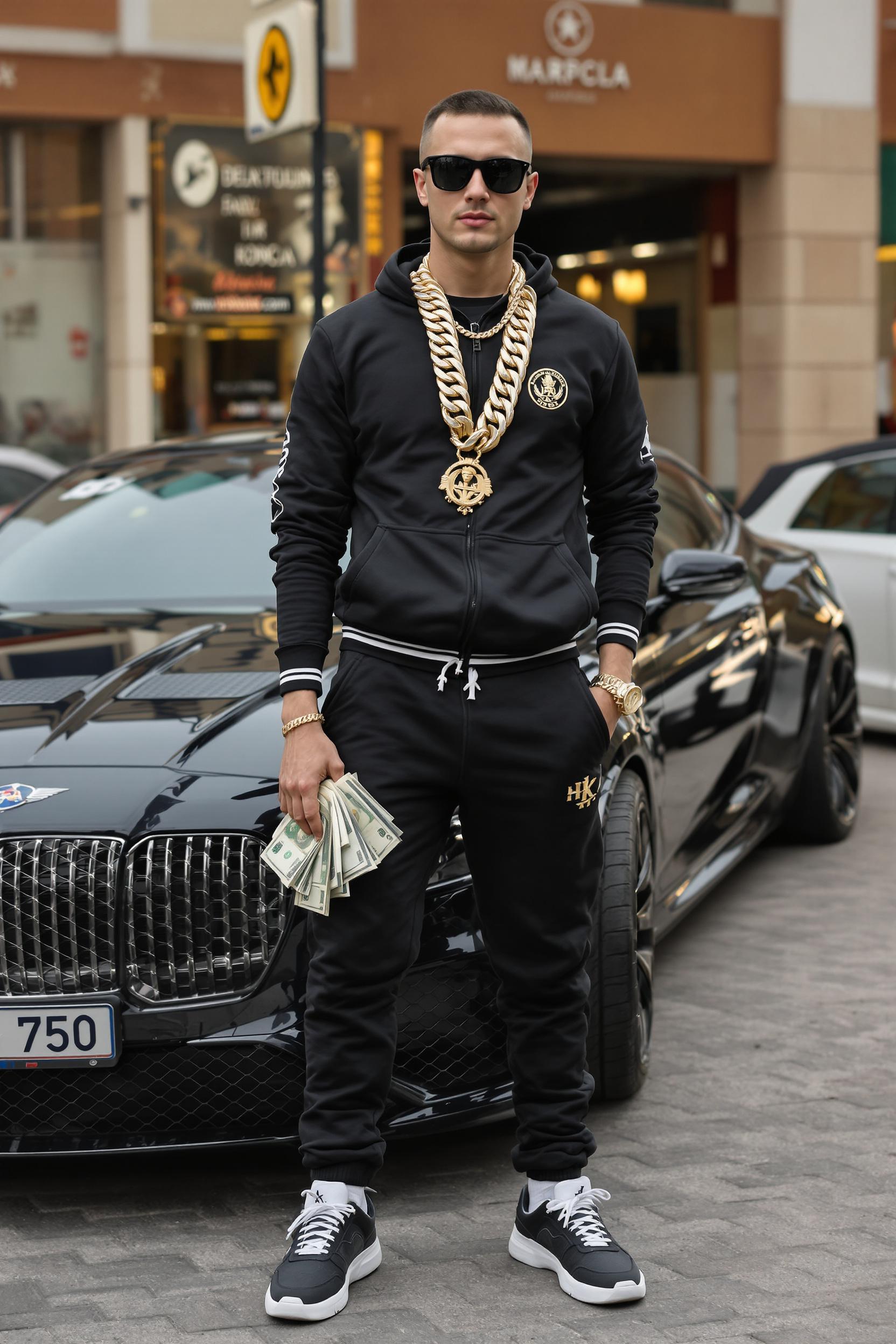 Мужчина в массивных золотых цепях и чёрных очках стоит на фоне дорогого авто с пачкой наличных в руке. На нём брендовый спортивный костюм и кроссовки, поза дерзкая. Крупный план, атмосфера роскоши и вызова.