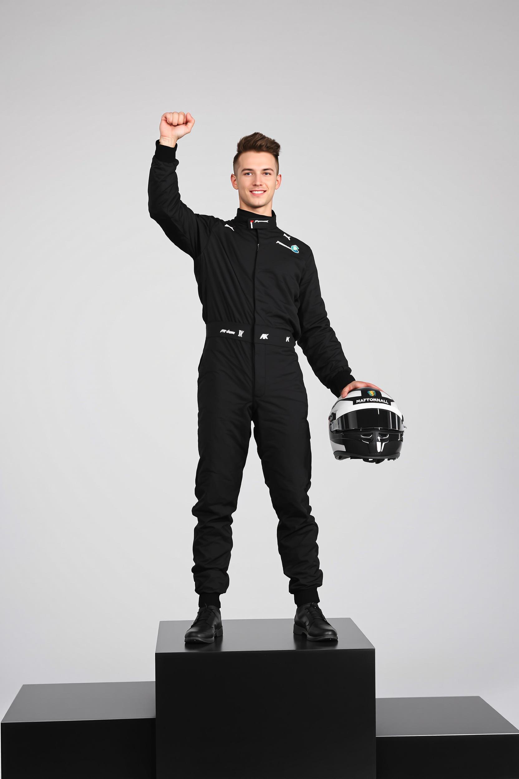 Мужчина в минималистичном черном гоночном комбинезоне без лишних деталей, стоит на пьедестале с одной рукой, поднятой вверх в жесте победы, шлем зажат под другой рукой, прямо смотрит в объектив, вокруг только строгие линии подиума и чистый фон.