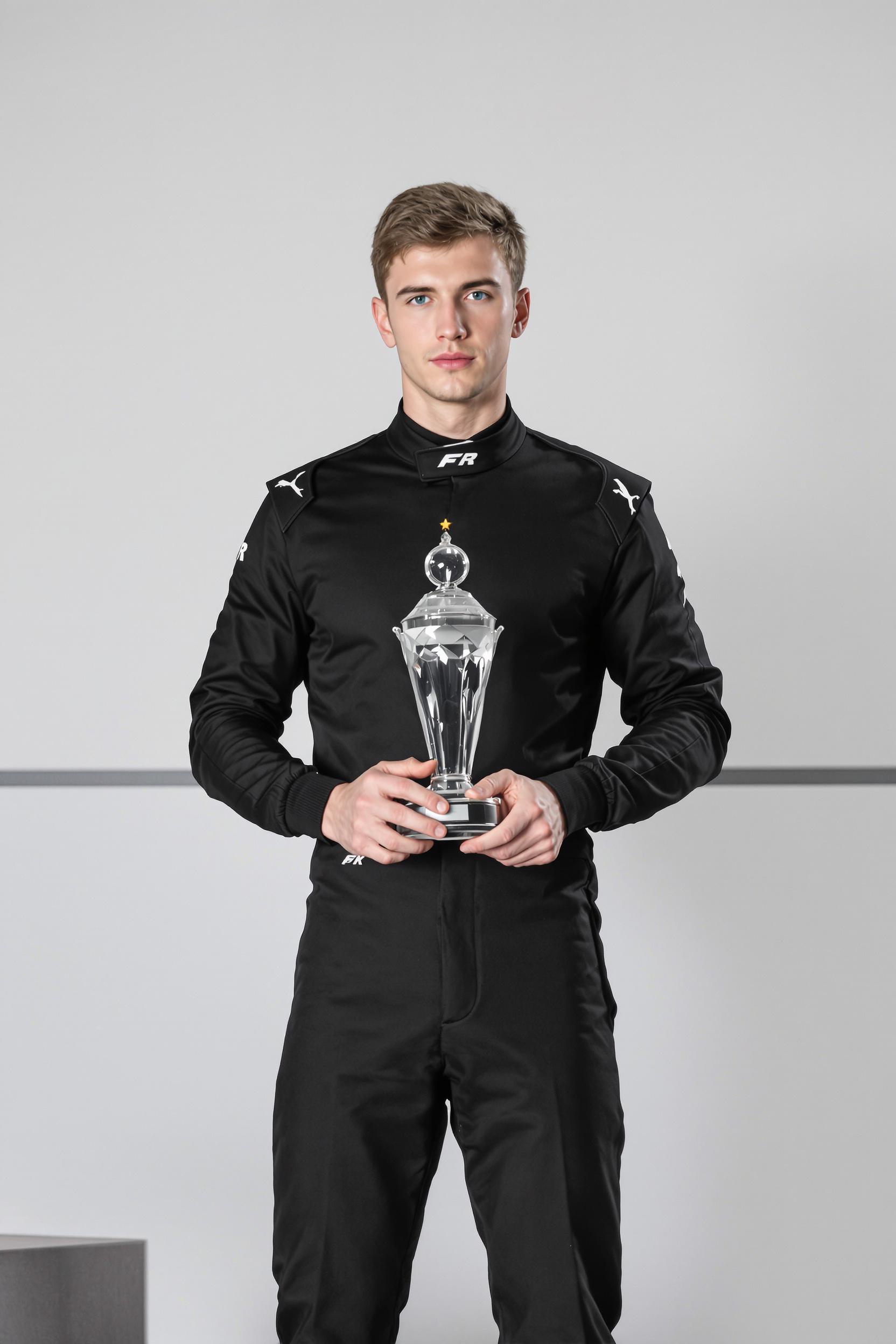 Мужчина в минималистичном черном гоночном комбинезоне с матовой текстурой, стоит на пьедестале, держа прозрачный кубок обеими руками, смотрит прямо в камеру, позади однотонный фон и тонкая горизонтальная линия подиума.