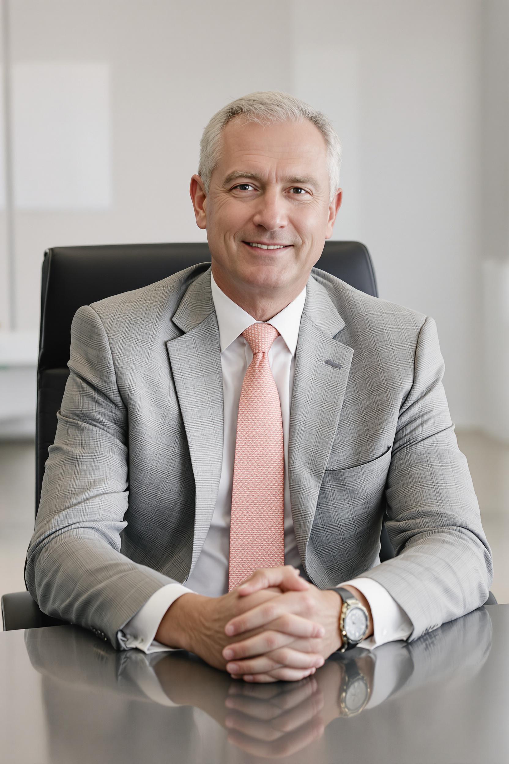 Мужчина средних лет в минималистичном светло-сером костюме и белой рубашке без галстука, сидит на офисном стуле у переговорного стола, локти лежат на столешнице, пальцы сцеплены, внимательно смотрит в камеру, чистый современный интерьер, средний план.