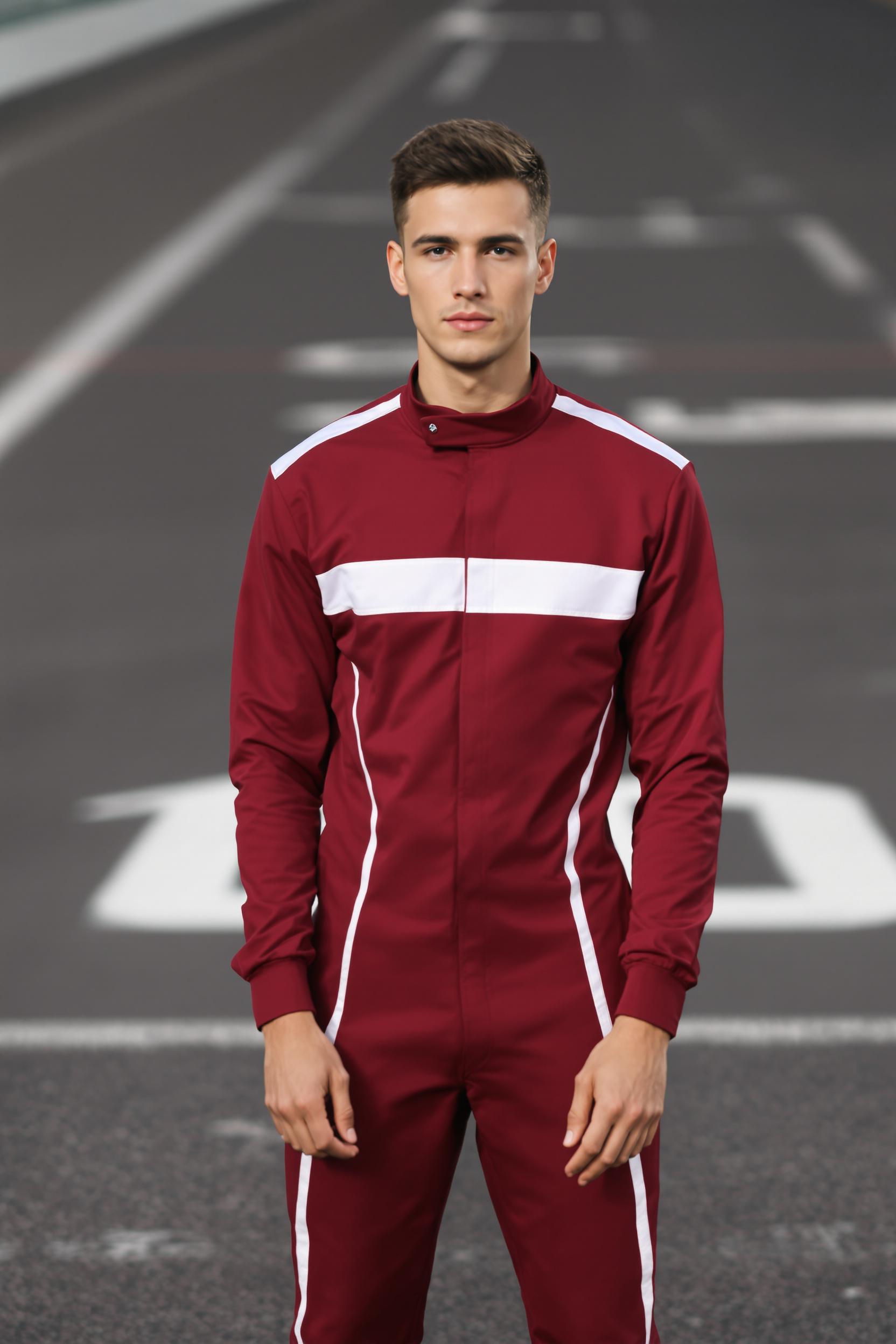 Мужчина в минималистичном тёмно-красном гоночном комбинезоне с тонкой белой полосой и аккуратными манжетами, стоит на трассе, обе руки опущены вдоль тела, уверенно смотрит в камеру, фон — чистое покрытие асфальта и размытая стартовая разметка.