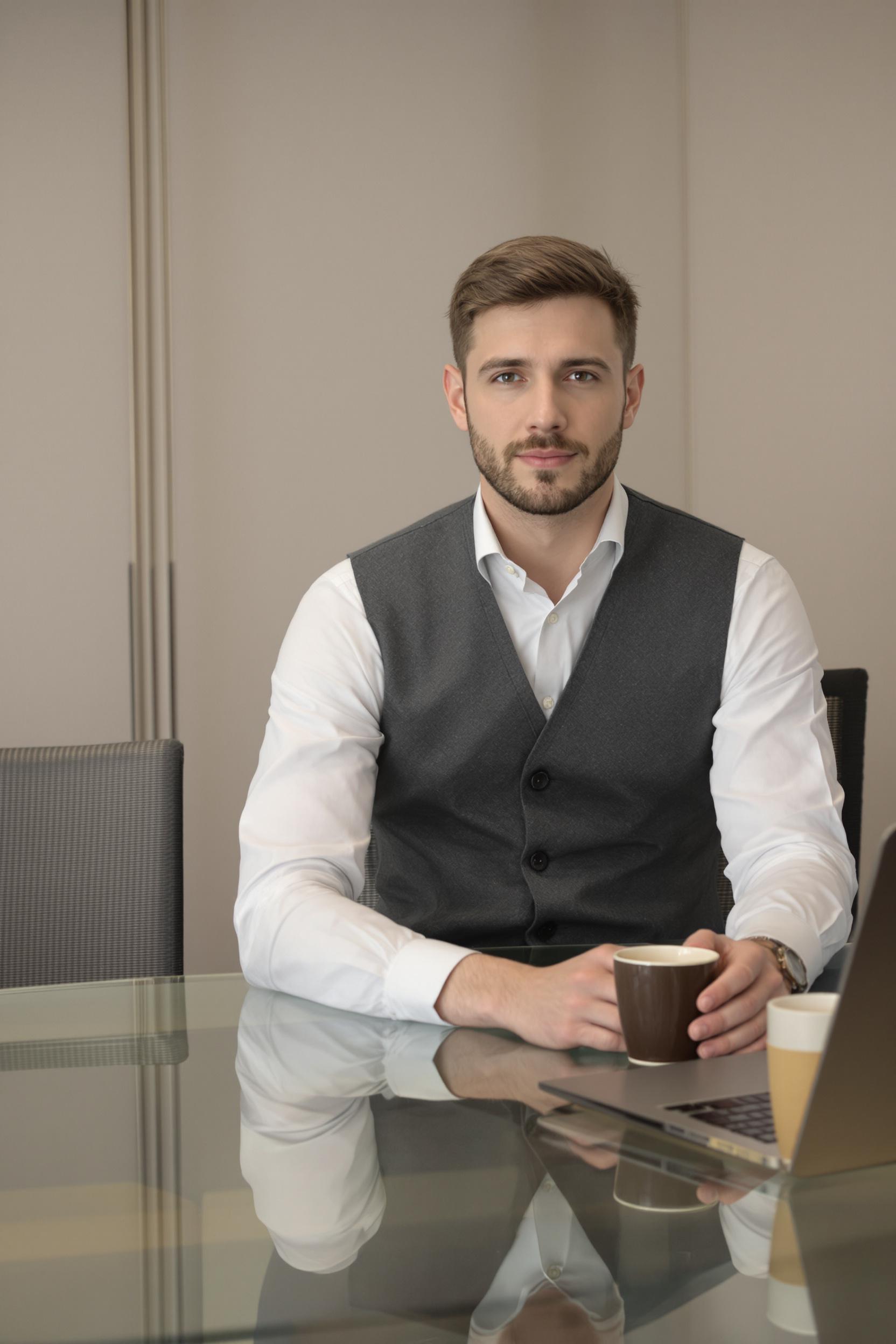 Мужчина в минималистичном темно-сером жилете поверх белой рубашки с длинным рукавом, без аксессуаров, сидит за стеклянным столом в переговорной, одна рука лежит на рабочем ноутбуке, другая держит чашку, средний план, уверенный деловой взгляд в камеру.