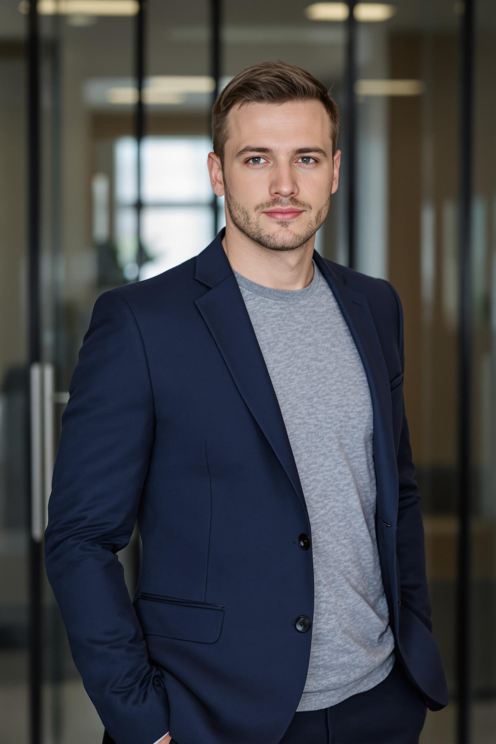 Мужчина в минималистичном темно-синем костюме и простой серой футболке под пиджаком, отсутствие аксессуаров, стоит на фоне переговорной со стеклянными дверями, средний план, уверенный серьезный взгляд в камеру, строгий деловой образ.