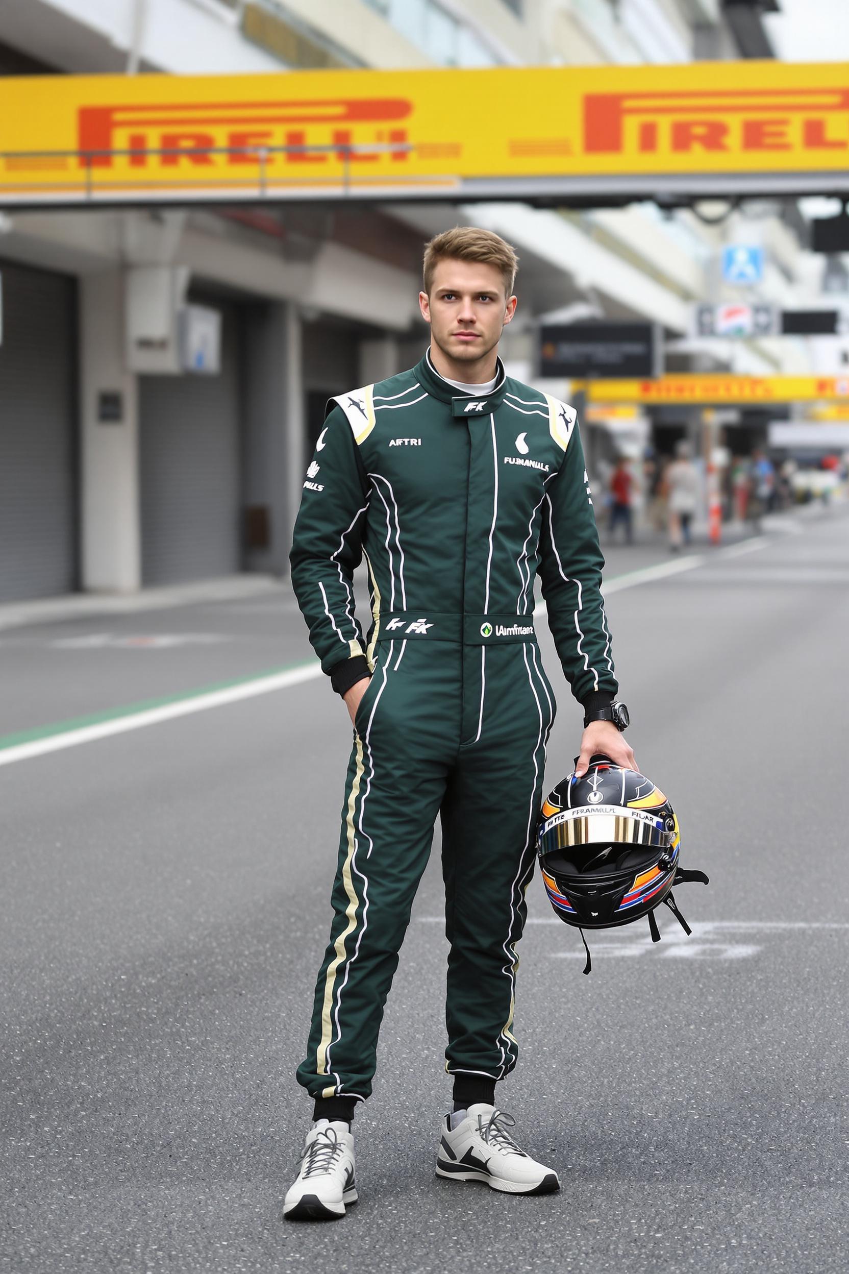 Мужчина в минималистичном тёмно-зеленом гоночном комбинезоне с лаконичными белыми линиями, стоит на трассе Формулы 1 у пьедестала, обе руки в карманах, шлем висит на запястье, уверенно смотрит прямо в камеру, фон — чистый асфальт.
