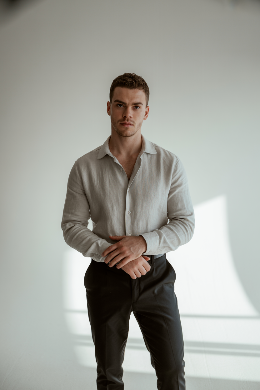 Мужчина в минималистичной студии стоит у гладкой белой стены, одет в светло-серую рубашку свободного кроя и прямые чёрные брюки. Руки сложены перед собой, поза уверенная, взгляд пристальный, направлен прямо в камеру. Вокруг чистое пространство и мягкое студийное освещение.