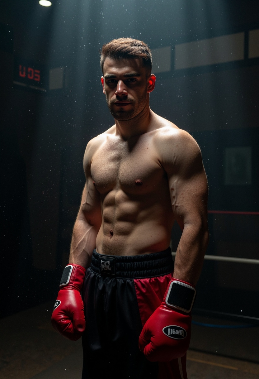 Мужчина в мокрой от пота форме боксёра стоит под душем из света, смотрит прямо в камеру, фон затемнён