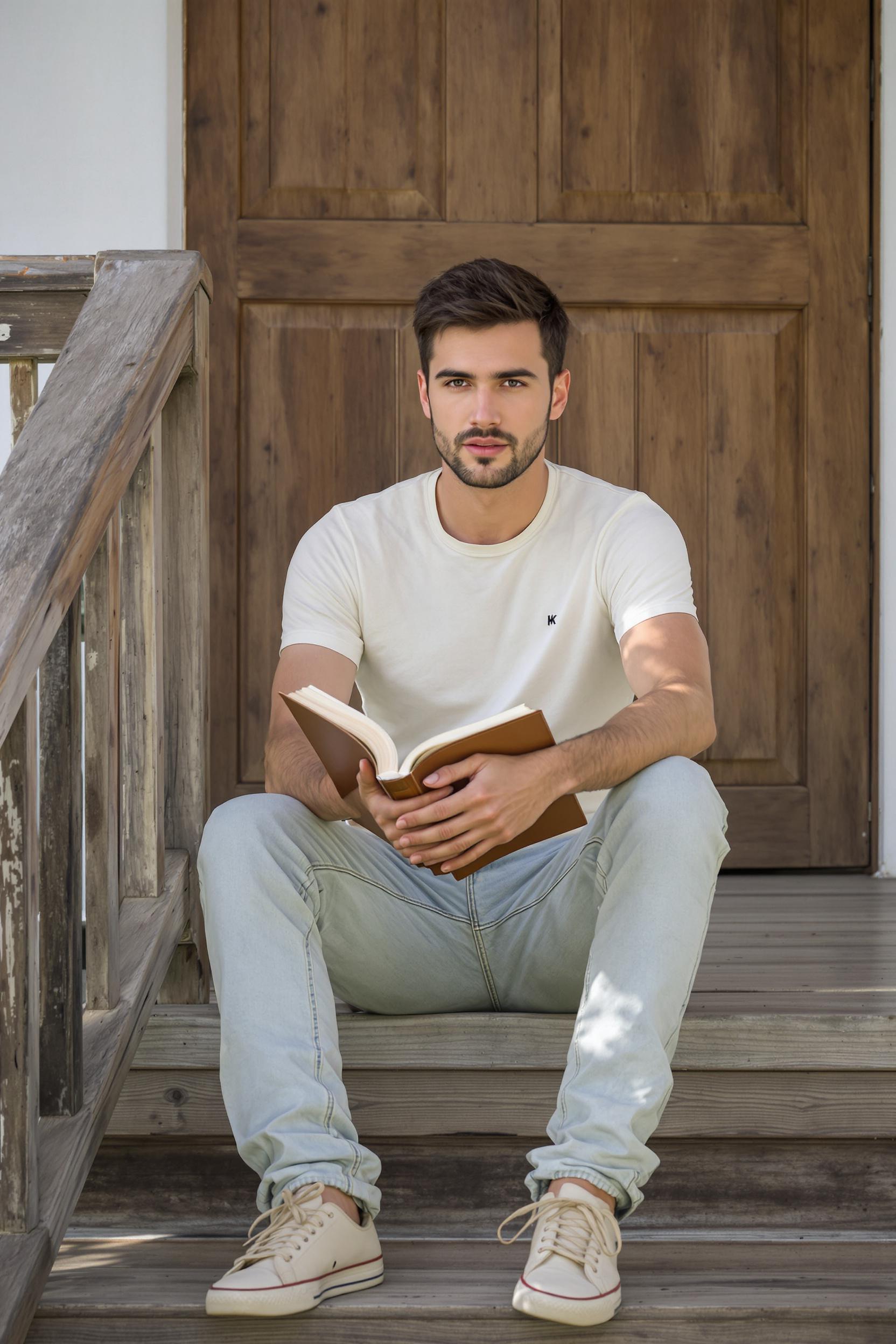 Мужчина в молочного цвета футболке с коротким рукавом и мягких хлопковых джинсах сидит на ступеньках деревянного крыльца дачного дома, держит открытую книгу на коленях, задумчиво смотрит в камеру. Летний день, минималистичный фон деревни.