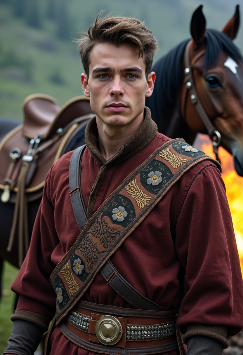 Мужчина в монгольской одежде с традиционным поясом и высоким воротом стоит у костра. Он смотрит в камеру, рядом его лошадь. Крупный план, акцент на уравновешенности и готовности.