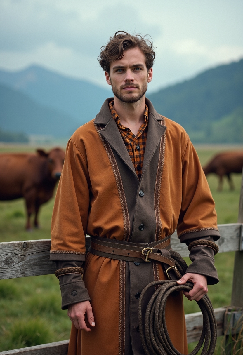 Мужчина в народном костюме с кафтаном и ремнём позирует на фоне пастбища с пасущимися коровами и деревянным забором. В руках он держит кнут и смотрит в камеру с серьёзным, но добродушным выражением. На заднем плане виднеются горы и спокойное голубое небо. Освещение естественное, акцент на его костюме и традиционном образе.