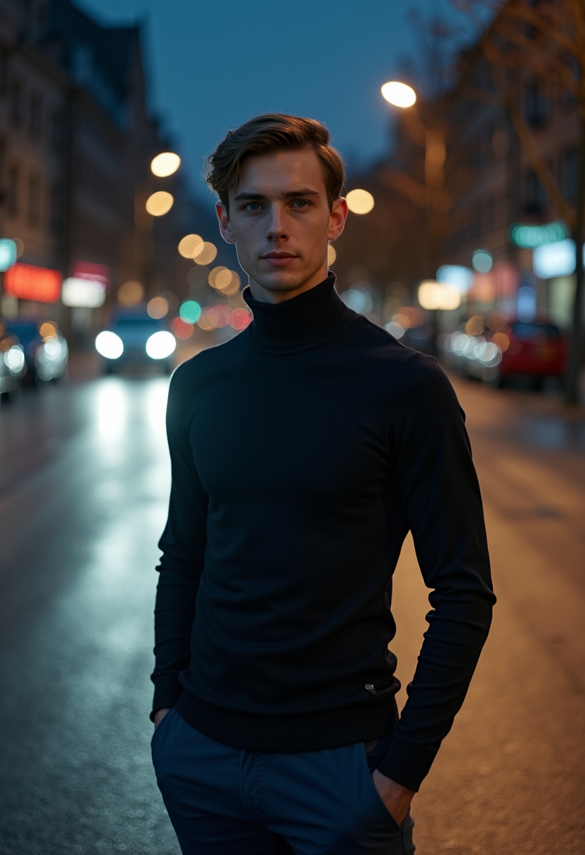 Мужчина в облегающей водолазке и тёмно-синих брюках стоит на пустой улице, его лицо освещено одиноким светом фар. Вдалеке видны силуэты зданий и мерцающие огни. Освещение точечное, создающее эффект кинематографической сцены.