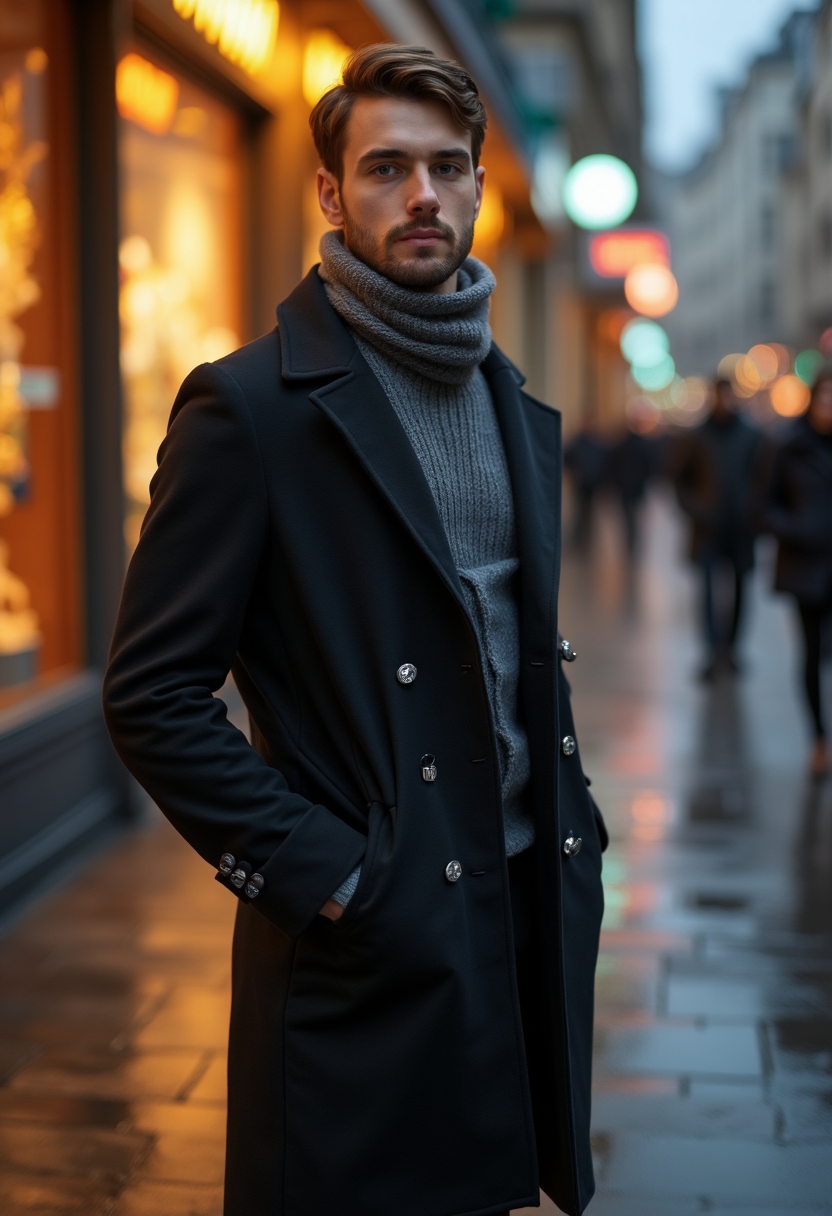 Мужчина в пальто и шарфе стоит на пешеходной улице, смотрит прямо в камеру, позади светящиеся витрины магазинов