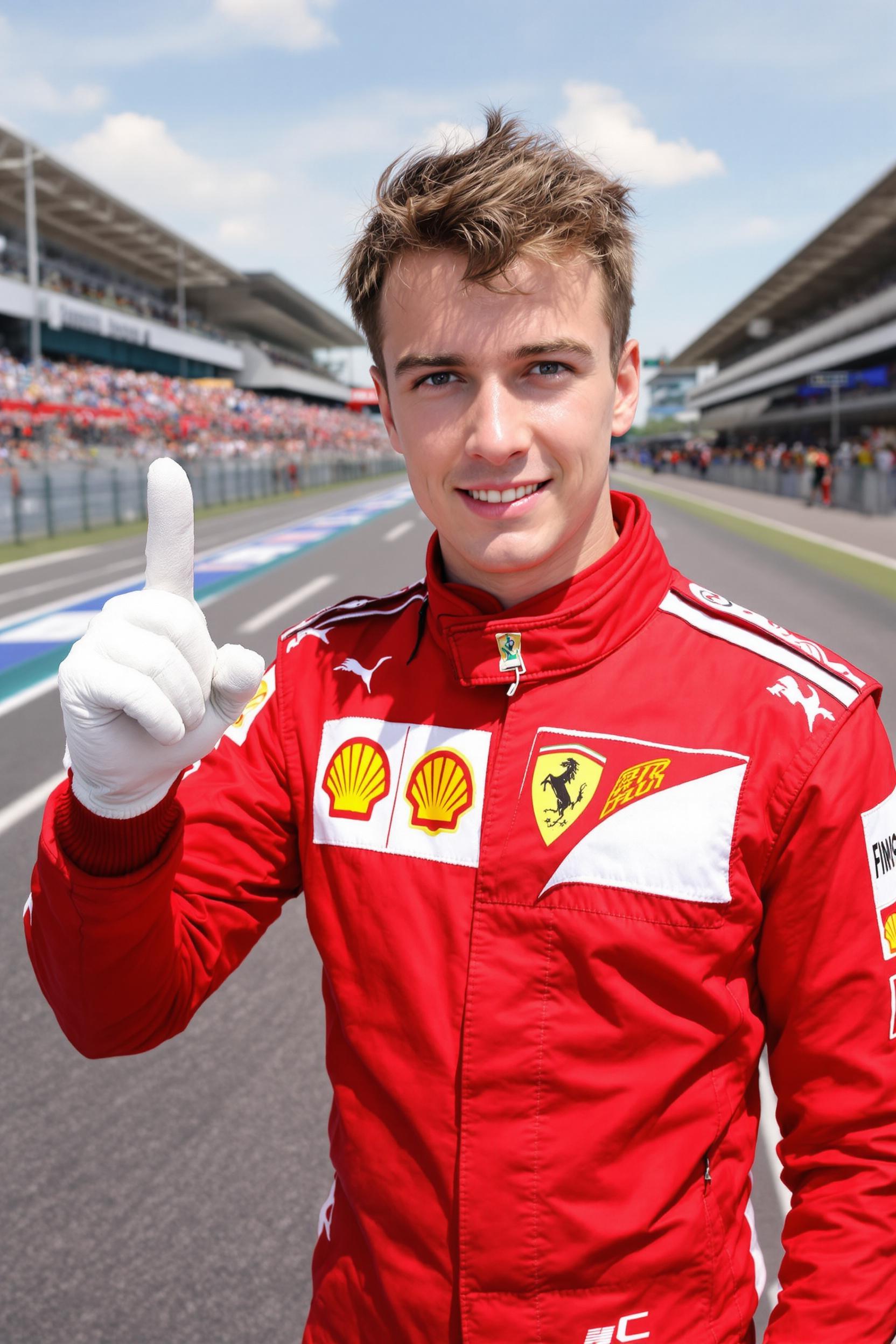 Мужчина в полностью застегнутом красном комбинезоне пилота Формулы 1, с белыми перчатками и черными гоночными ботинками, стоит на гоночной трассе, одна рука поднята в жесте победы, смотрит в камеру, за спиной финишная прямая и толпа болельщиков.