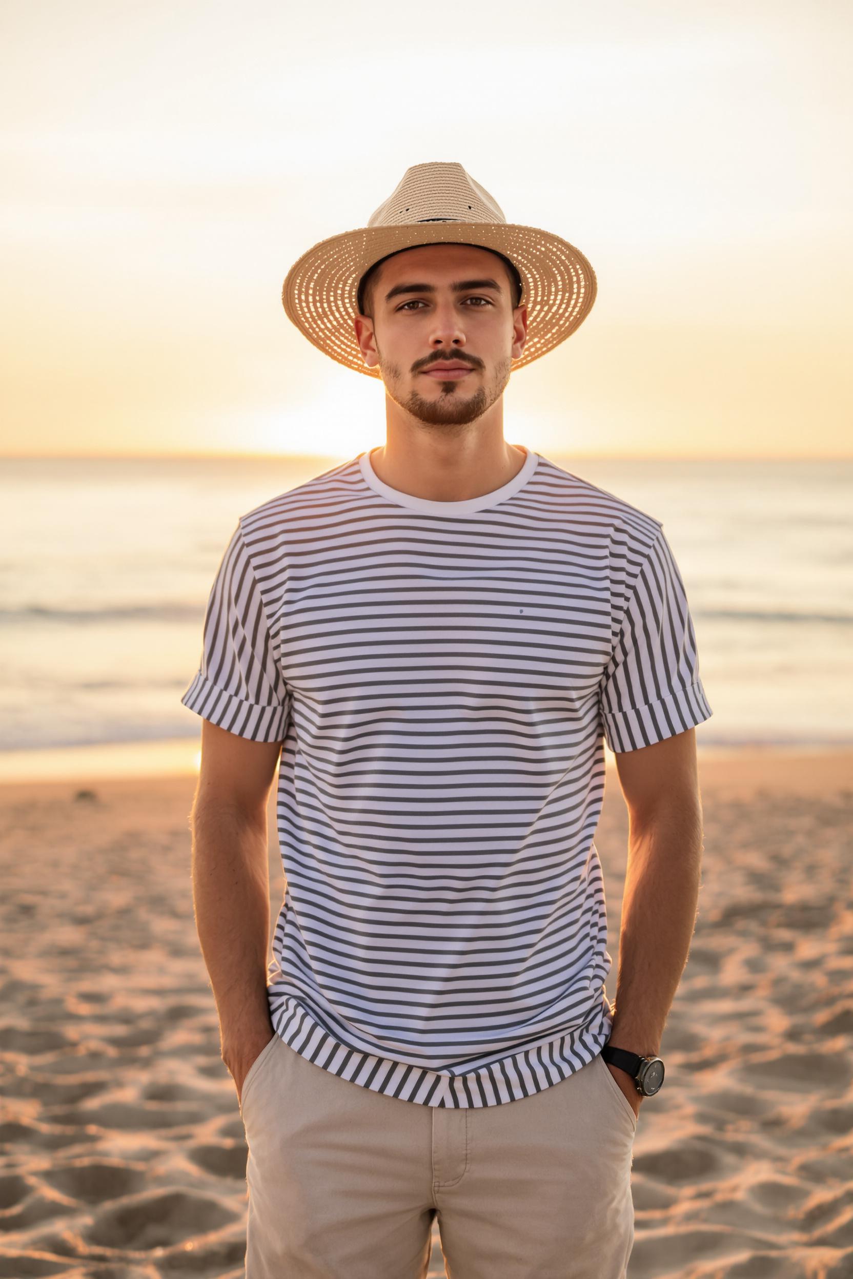 Мужчина в полосатой футболке, легких льняных бежевых брюках и соломенной шляпе стоит на фоне вечернего пляжа, мягкое закатное солнце окрашивает песок и морскую гладь, он смотрит прямо в камеру, позади золотистый горизонт.