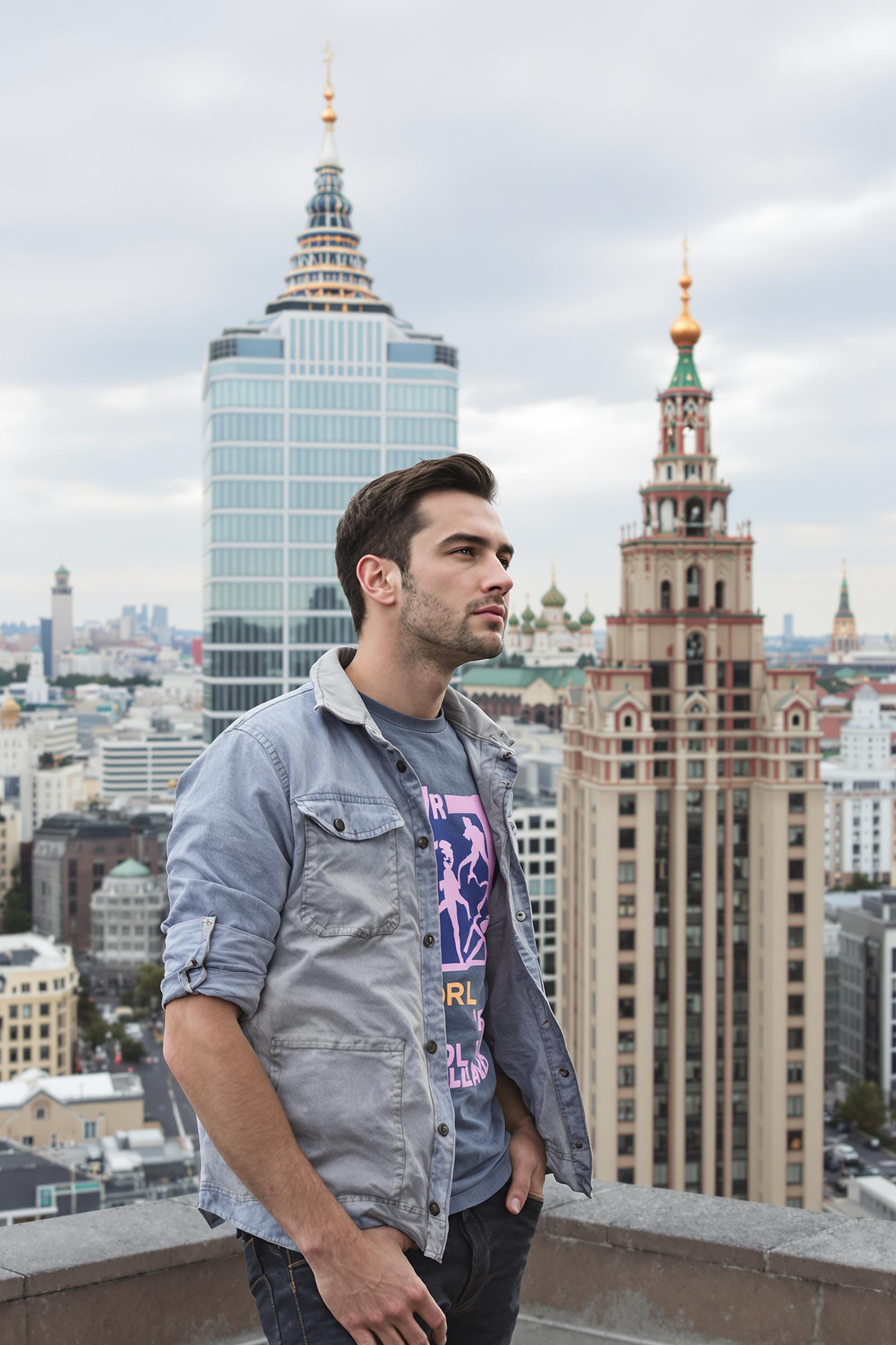 Мужчина в повседневной одежде стоит на крыше сталинской высотки в Москве, позади панорама города и Кремль вдалеке. Он смотрит вдаль, выражение лица задумчивое. Крупный план, дух мегаполиса.