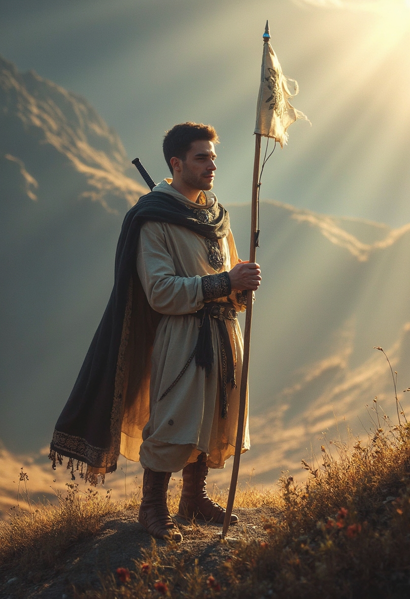 Мужчина в праздничном дел и сапогах стоит на склоне с флагом, смотрит в сторону. Его лицо освещено светом заката. Крупный план, образ воина и стража кочевой земли.