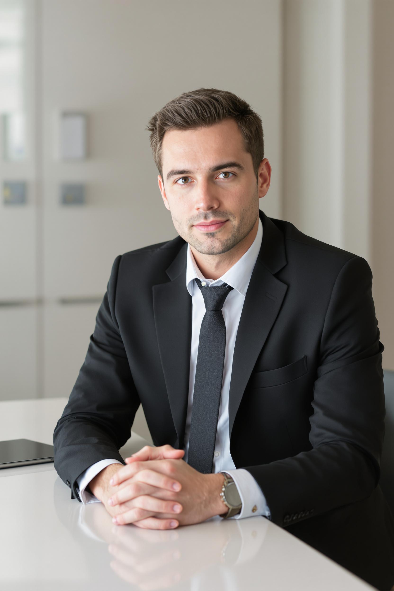 Мужчина в черном классическом костюме с матовой текстурой, белая сорочка без галстука, неброский фон оттенка светлого бетона, строгая и уверенная поза, деловой минимализм, средний план, взгляд направлен в камеру.