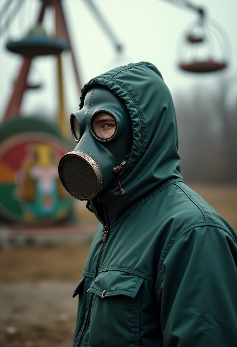 Мужчина в противогазе на фоне ржавых аттракционов парка развлечений в Припяти