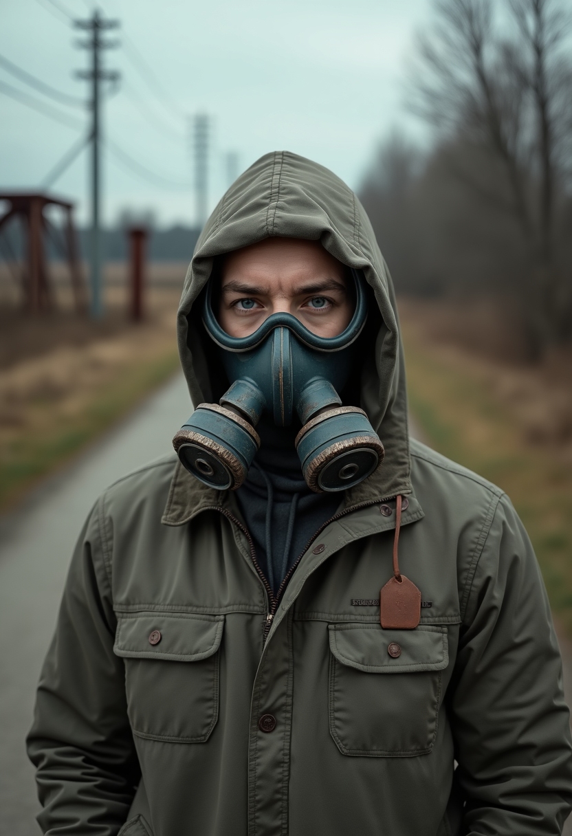 Мужчина в противогазе стоит на фоне ржавых аттракционов в Припяти, пристально смотрит в камеру