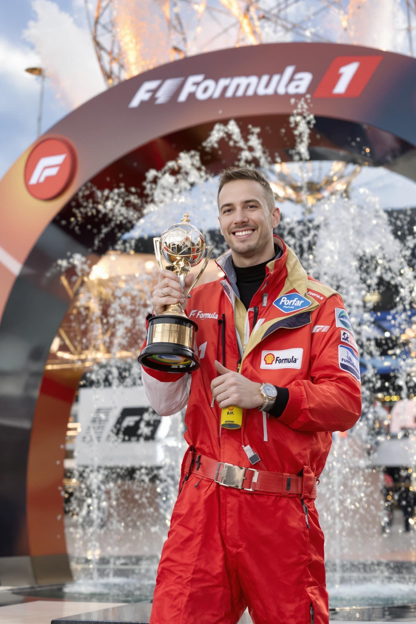 Мужчина в расстегнутом огнеупорном костюме пилота, под ним черная спортивная водолазка, стоит на пьедестале с кубком в руках, улыбается и смотрит в камеру, на фоне большая арка с символикой Формулы 1 и фонтан брызг шампанского.