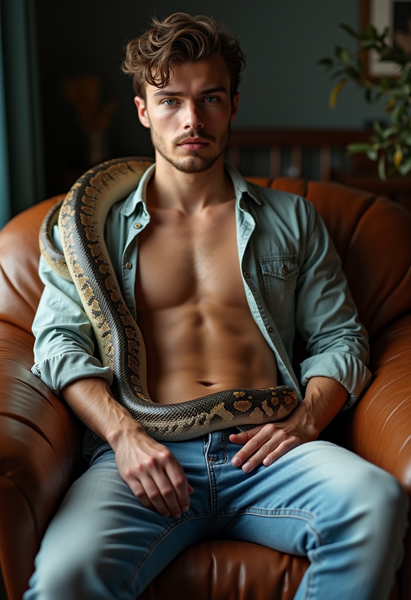 Мужчина в расстёгнутой рубашке и джинсах сидит на кожаном диване, крупный питон обвивается вокруг его плеча, он смотрит прямо в камеру