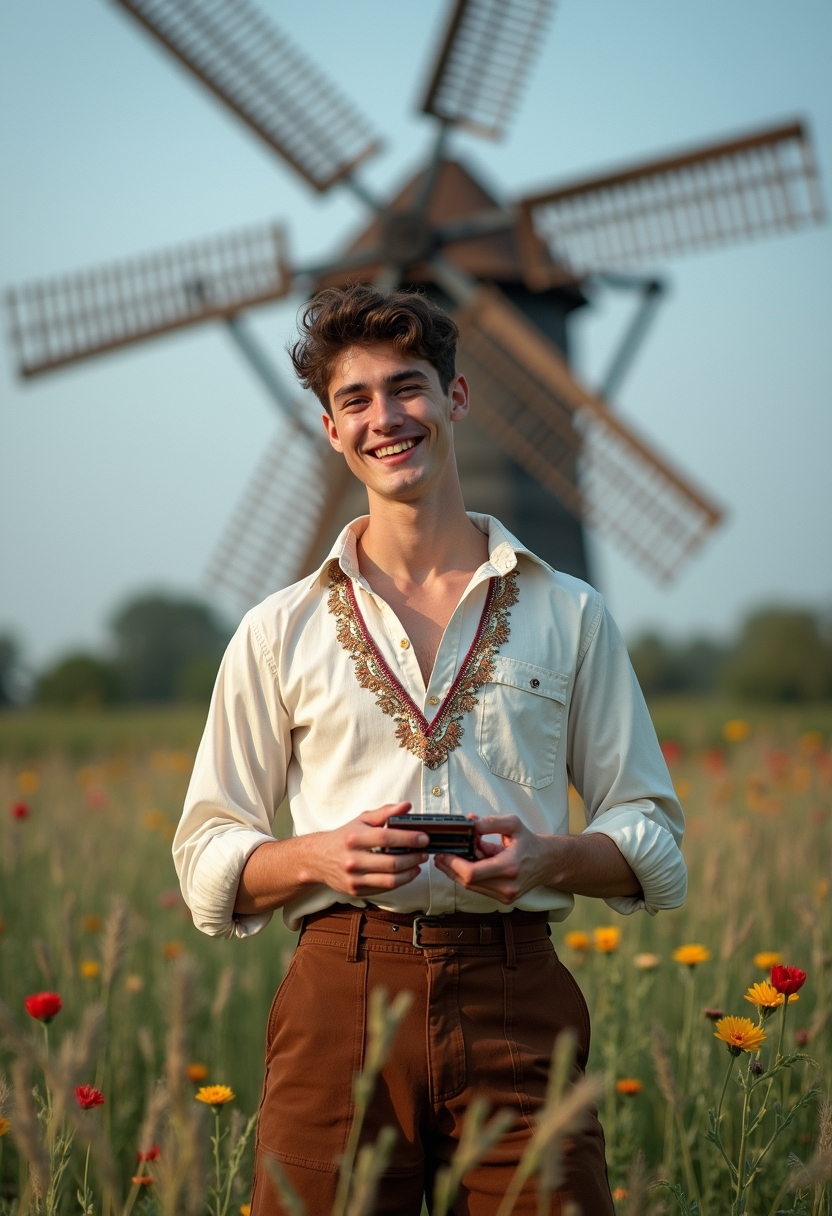 Мужчина в рубашке с вышивкой и широких штанах позирует на фоне старой деревянной мельницы, окружённой полями и цветами. В руках он держит гармонь и с радостью смотрит в камеру. Освещение ясное, акцент на его лице и культуре.