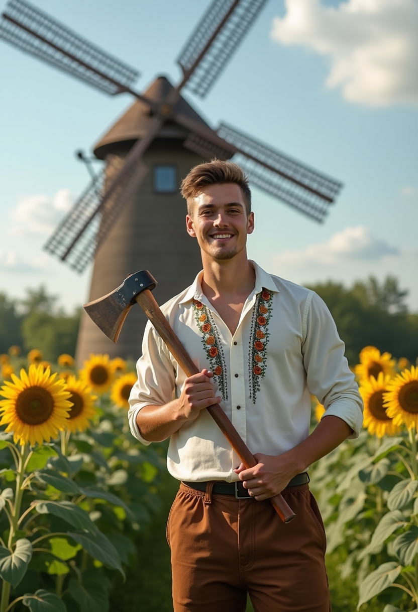 Мужчина в рубашке с вышивкой и широких штанах позирует на фоне старой деревянной мельницы, окружённой зелеными полями и высокими солнцецветами. В руках он держит топор и с радостью смотрит в камеру. На заднем плане видны цветущие растения и небо с легкими облаками. Освещение ясное, акцент на его лице и культуре.