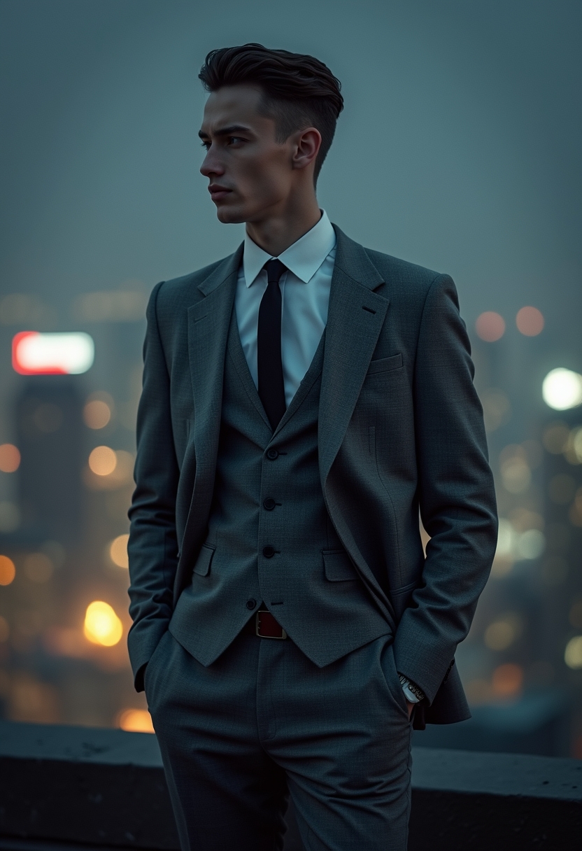 Мужчина в сером костюме без галстука стоит на крыше небоскрёба, позади панорама ночного города. Его руки в карманах, взгляд направлен вбок. Свет от далёких вывесок и окон отражается на его лице. Освещение естественное, подчёркивающее силуэт.
