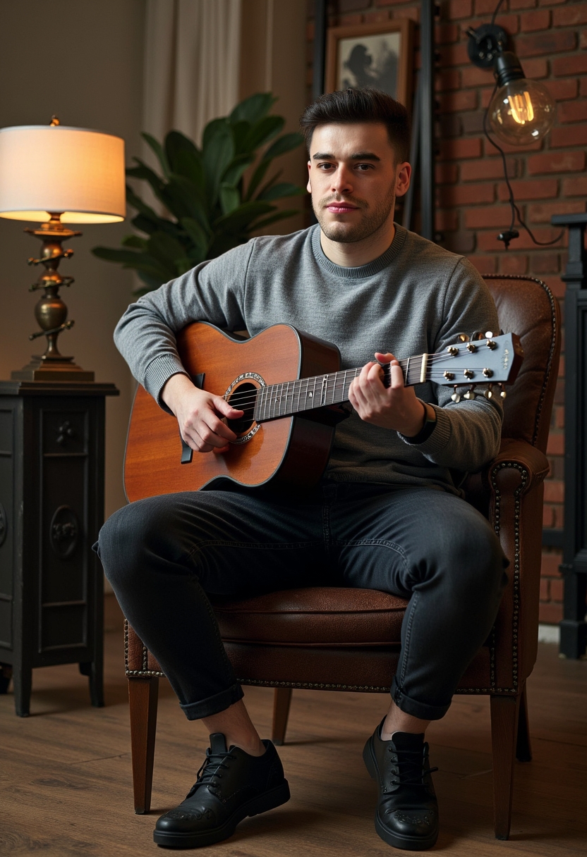 Примерить образ на себеМужчина в сером свитере и ботинках сидит на винтажном стуле, держит гитару на коленях, вокруг кирпичные стены и индустриальные лампы, он смотрит прямо в камеру