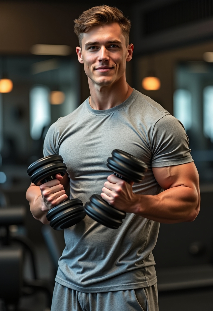 Мужчина в серой футболке и спортивных штанах держит гантели, выполняя упражнение на бицепс. Он смотрит прямо в камеру с лёгкой улыбкой. Позади видны стены тренажёрного зала с зеркалами. Освещение тёплое, акцент на его уверенности и профессионализме.
