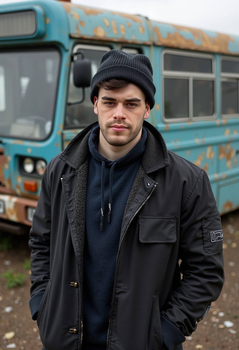 Мужчина в шапке-ушанке и пальто стоит перед заброшенным автобусом, смотрит в камеру, вокруг облезлая краска