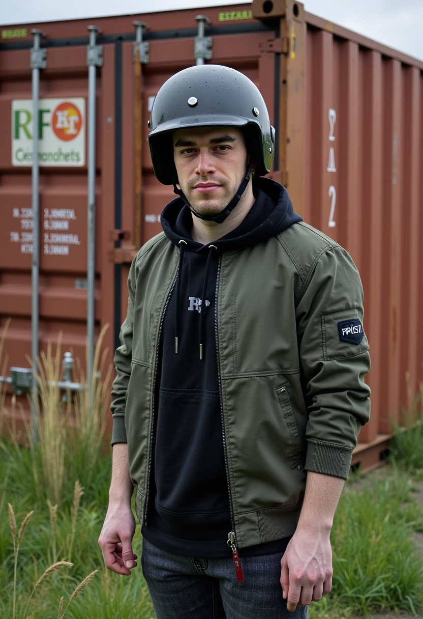 Мужчина в шлеме стоит перед ржавым контейнером, прямо смотрит в камеру, вокруг высокая трава