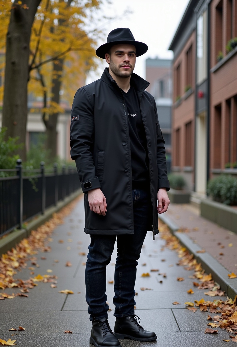 Мужчина в шляпе и пальто стоит среди опавших листьев на тихой аллее