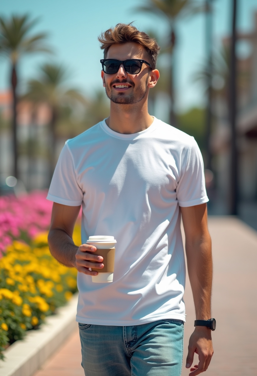 Мужчина в солнцезащитных очках и белой футболке идёт вдоль сочинской набережной, держа в руке чашку кофе. Его выражение лица расслабленное, а позади цветущие клумбы и пальмы. Крупный план, подчёркивающий энергетику города-курорта.