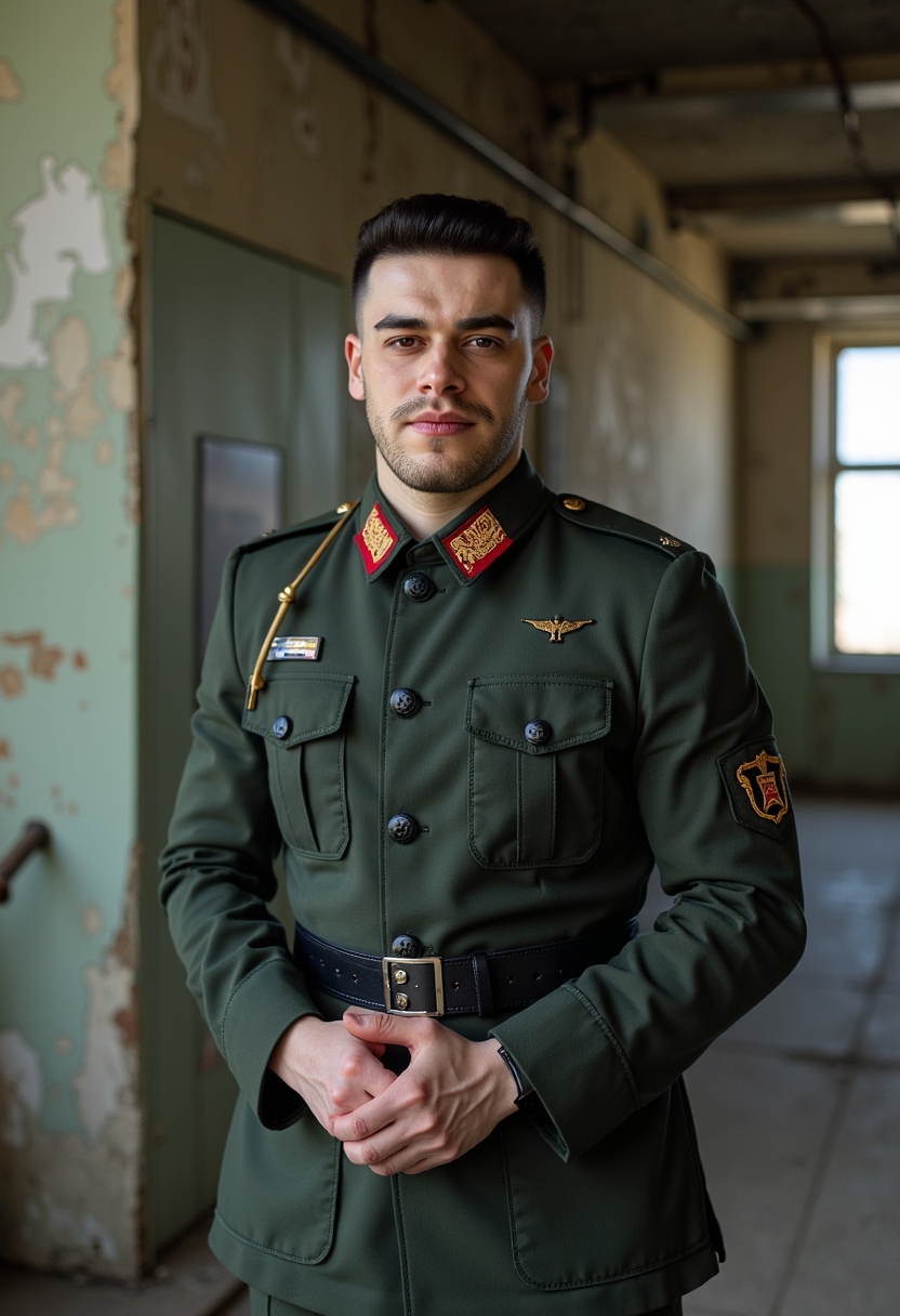 Мужчина в советской военной форме стоит на фоне старого завода, смотрит прямо в камеру, вокруг облезшие стены
