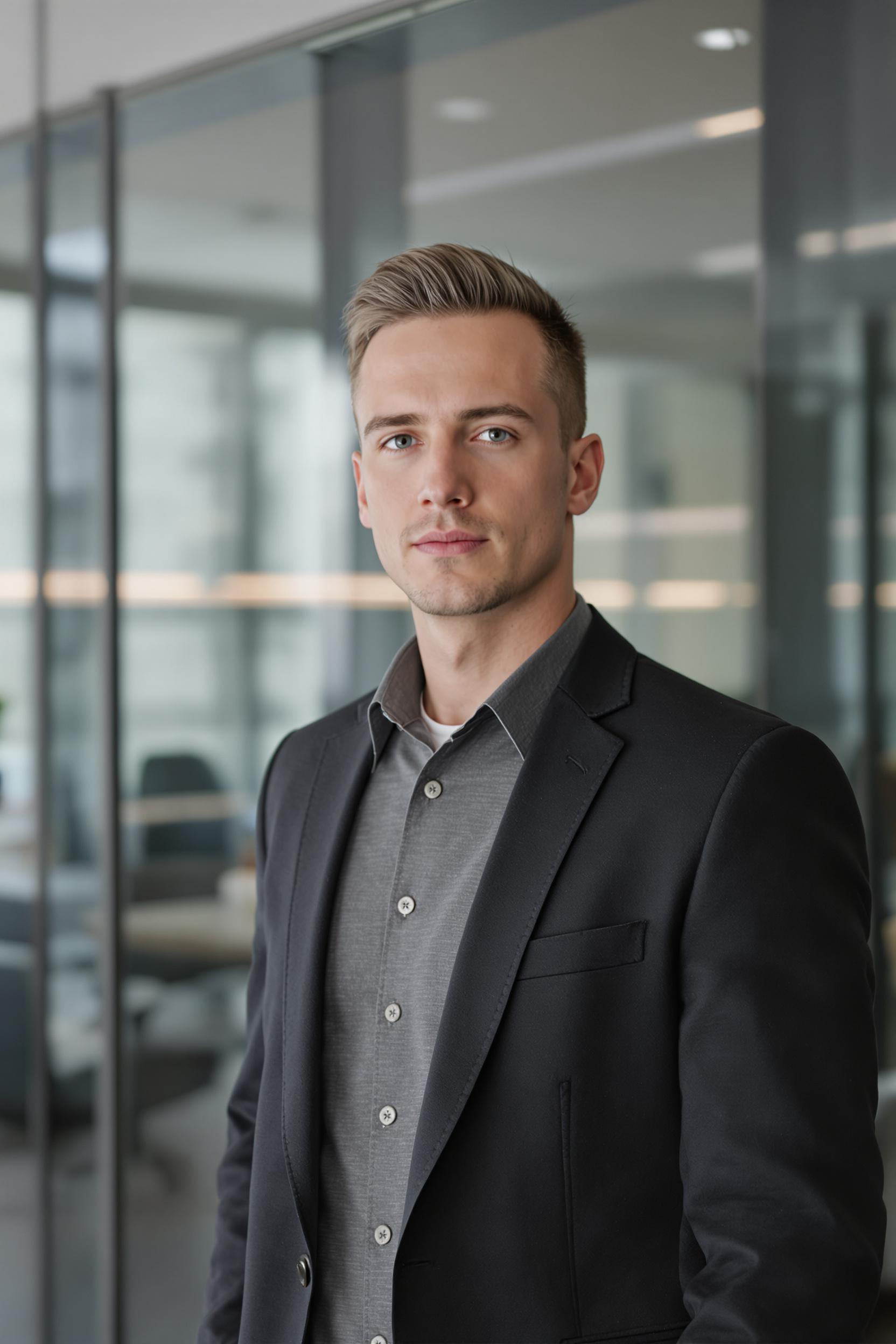 Мужчина в современном тёмно-графитовом пиджаке и серой лонгслив-рубашке, отсутствуют аксессуары, на фоне переговорной с большими стеклянными панелями, стоит на среднем плане, смотрит прямо в камеру, деловой минимализм, атмосфера собранности.