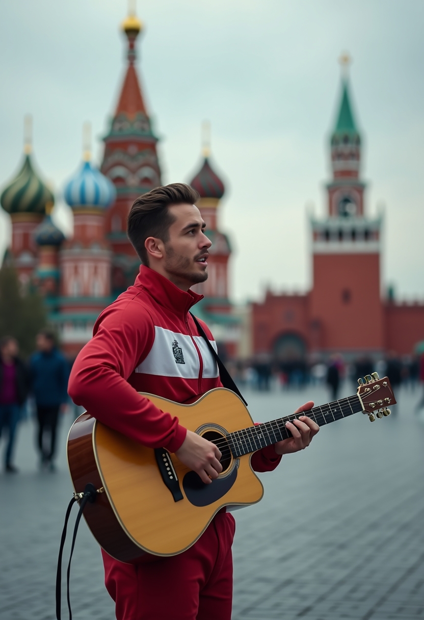 Мужчина в спортивном костюме стоит на площади у Красной площади в Москве, играя на гитаре, привлекая внимание прохожих и туристов.