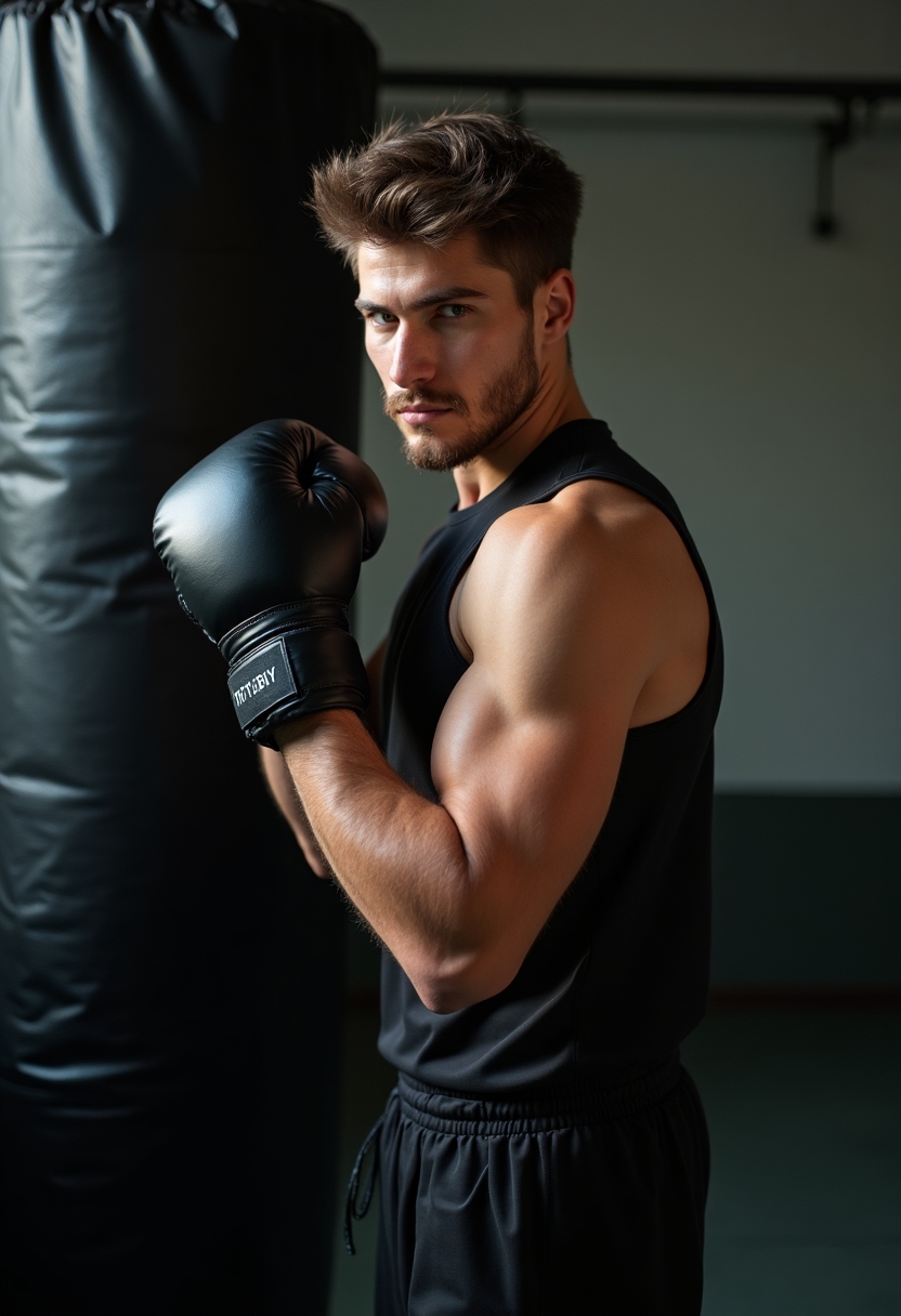 Мужчина в спортивной одежде делает удар по груше, поворачивает голову к камере, серьёзное выражение лица