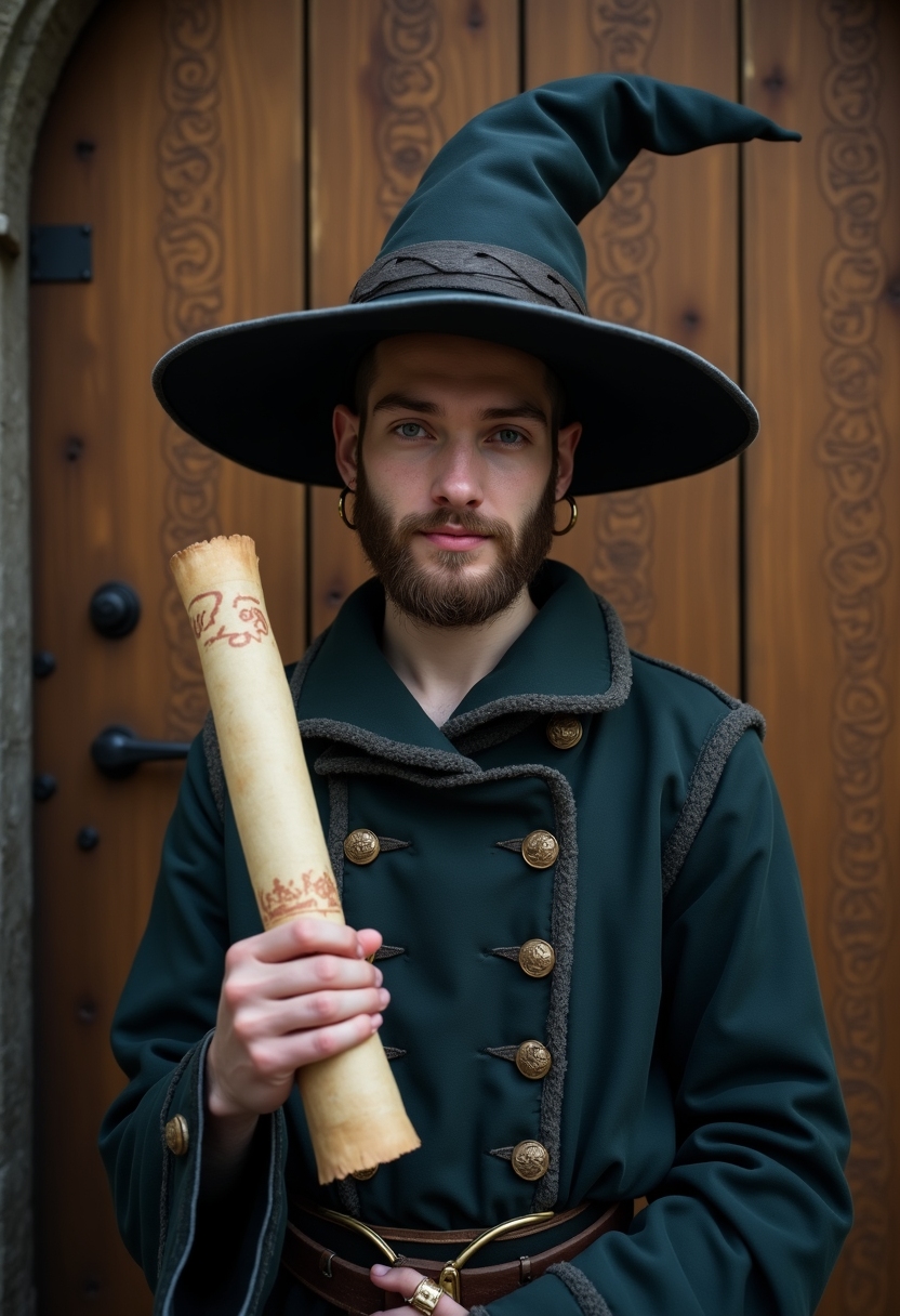 Мужчина в старинной шляпе волшебника стоит на фоне деревянной двери с гравировкой, смотрит прямо в камеру, держит свиток