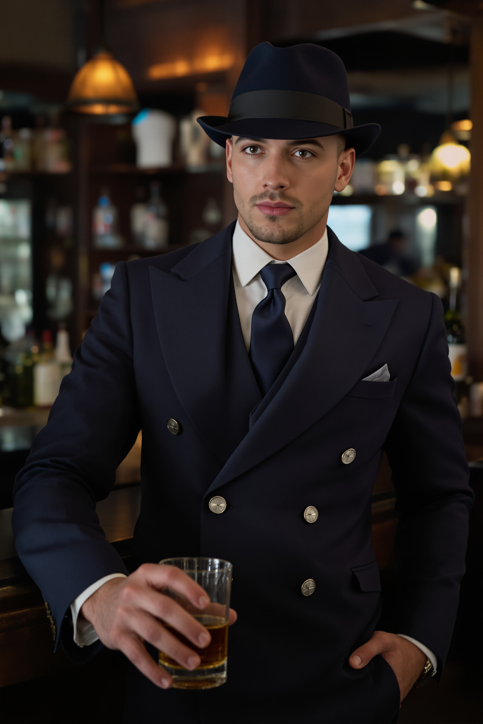 Мужчина в стиле гангстера 1920-х годов: двубортный тёмно-синий пиджак, жилет, белая рубашка с жёстким воротником, тёмный галстук, шляпа-трилби. Он стоит, облокотившись одной рукой о барную стойку, другой держит стакан с виски, крупный план, уверенный пристальный взгляд в камеру.
