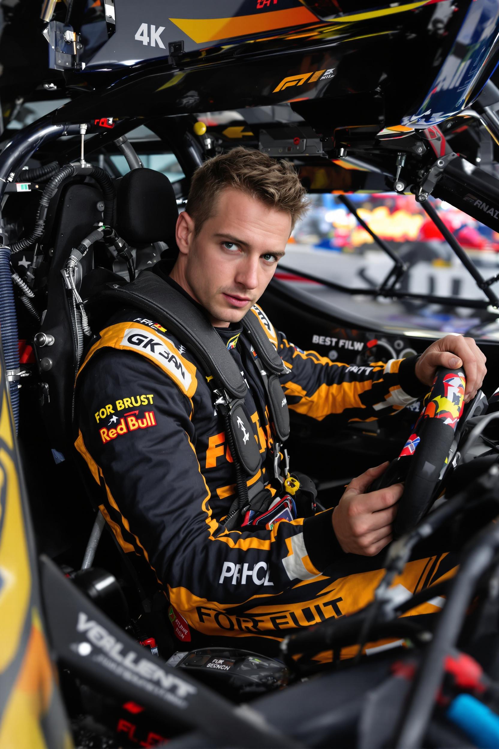 Мужчина в стильном гоночном костюме с яркими акцентами, сидит в кабине болида Формулы 1, держит руль обеими руками, повернул голову и уверенно смотрит прямо в объектив камеры, вокруг детали интерьера болида и элементы приборной панели.