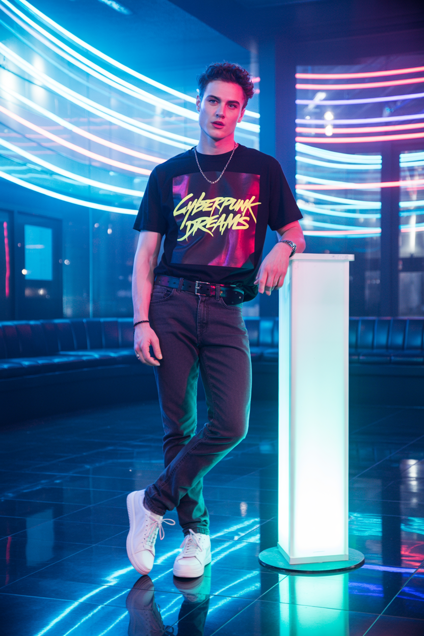 Мужчина в стильном городском клубе, одет в черную футболку с ярким неоновым принтом, облегающие темные джинсы и белые кроссовки, стоит у светящегося подиума, слегка склонив голову и уверенно смотрит прямо в камеру. Вокруг световые линии, клубная атмосфера, отражения на стеклянном полу.