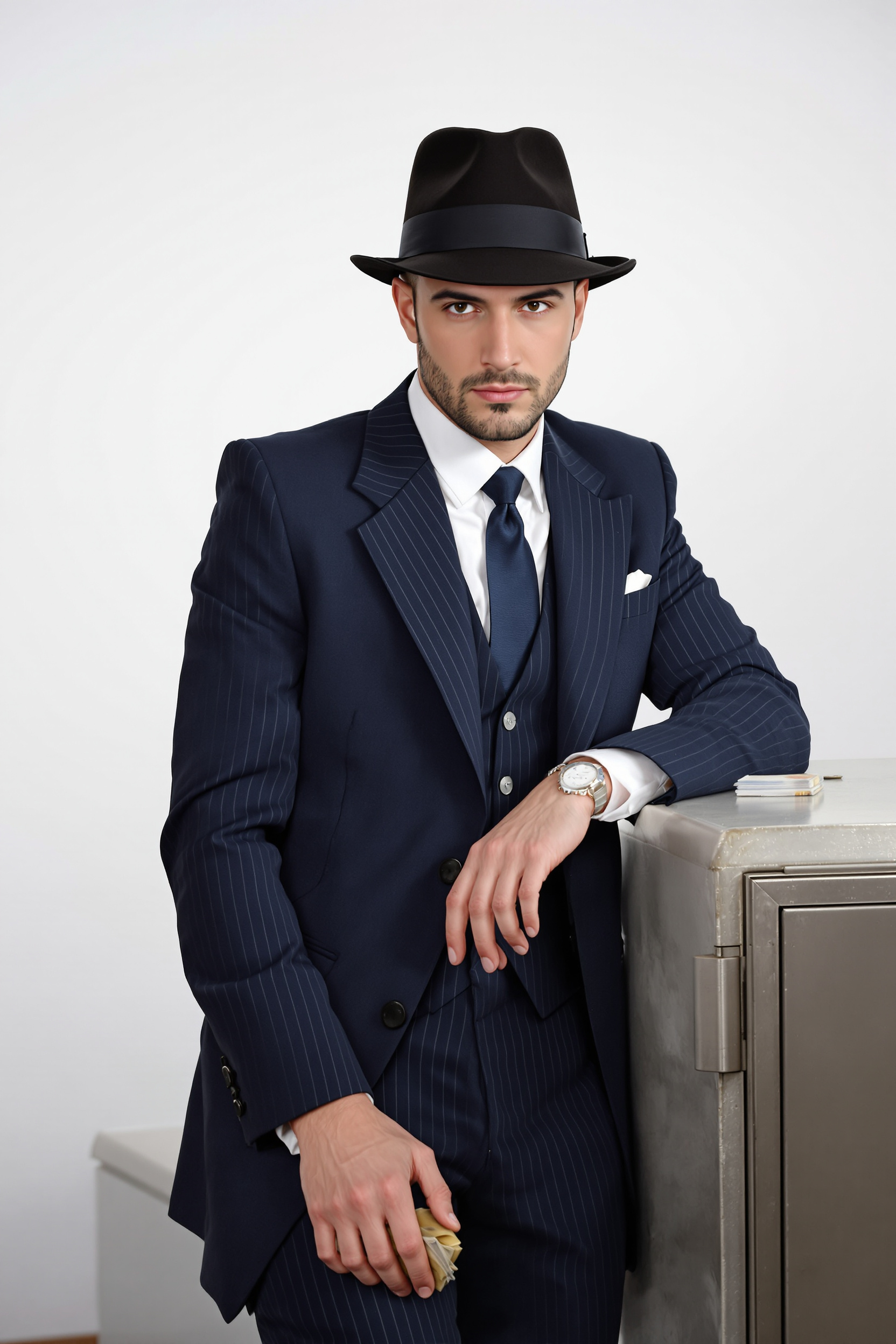 Мужчина в стильном темно-синем костюме гангстера 1920-х, пиджак с отворотами, белая наглаженная рубашка, шёлковый тёмный галстук, на голове аккуратная шляпа-федора. Он опирается одной рукой на массивный сейф, в другой держит пачку старых банкнот, уверенно смотрит в камеру.