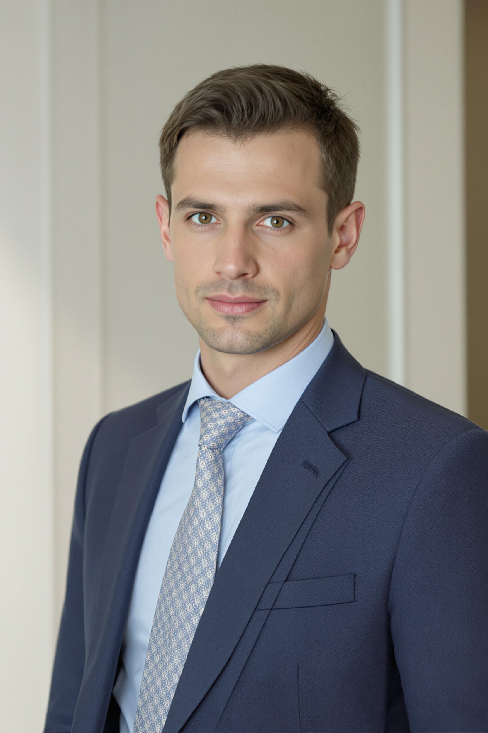 Мужчина в строгом тёмно-синем костюме, светло-голубая классическая рубашка, отсутствуют яркие детали и украшения, позирует на фоне светлого минималистичного интерьера, уверенный взгляд направлен в камеру, средний план, деловая атмосфера.