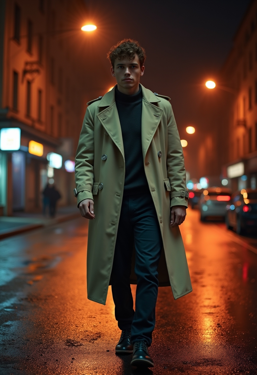 Мужчина в светло-бежевом тренче идёт вдоль заброшенного квартала, его фигура освещена редкими фонарями. Позади тёмные окна зданий, неоновый свет отражается на мокром асфальте. Освещение контрастное, подчёркивающее его уверенный шаг.