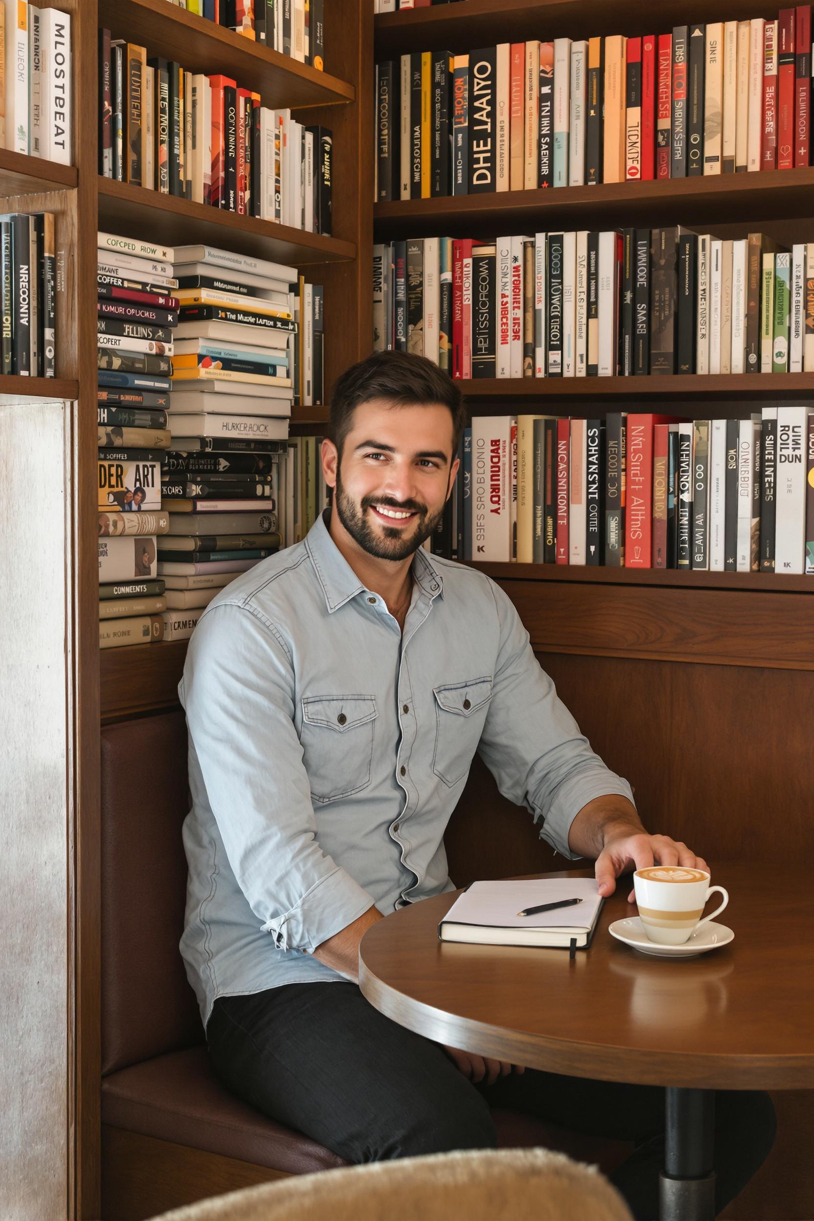 Мужчина в светло-голубой джинсовой рубашке и чёрных брюках сидит за небольшим столиком у стены с книгами в уютной кофейне. На столе чашка капучино и блокнот, он смотрит прямо в камеру с мягкой улыбкой, вокруг тёплый дневной свет, средний план.