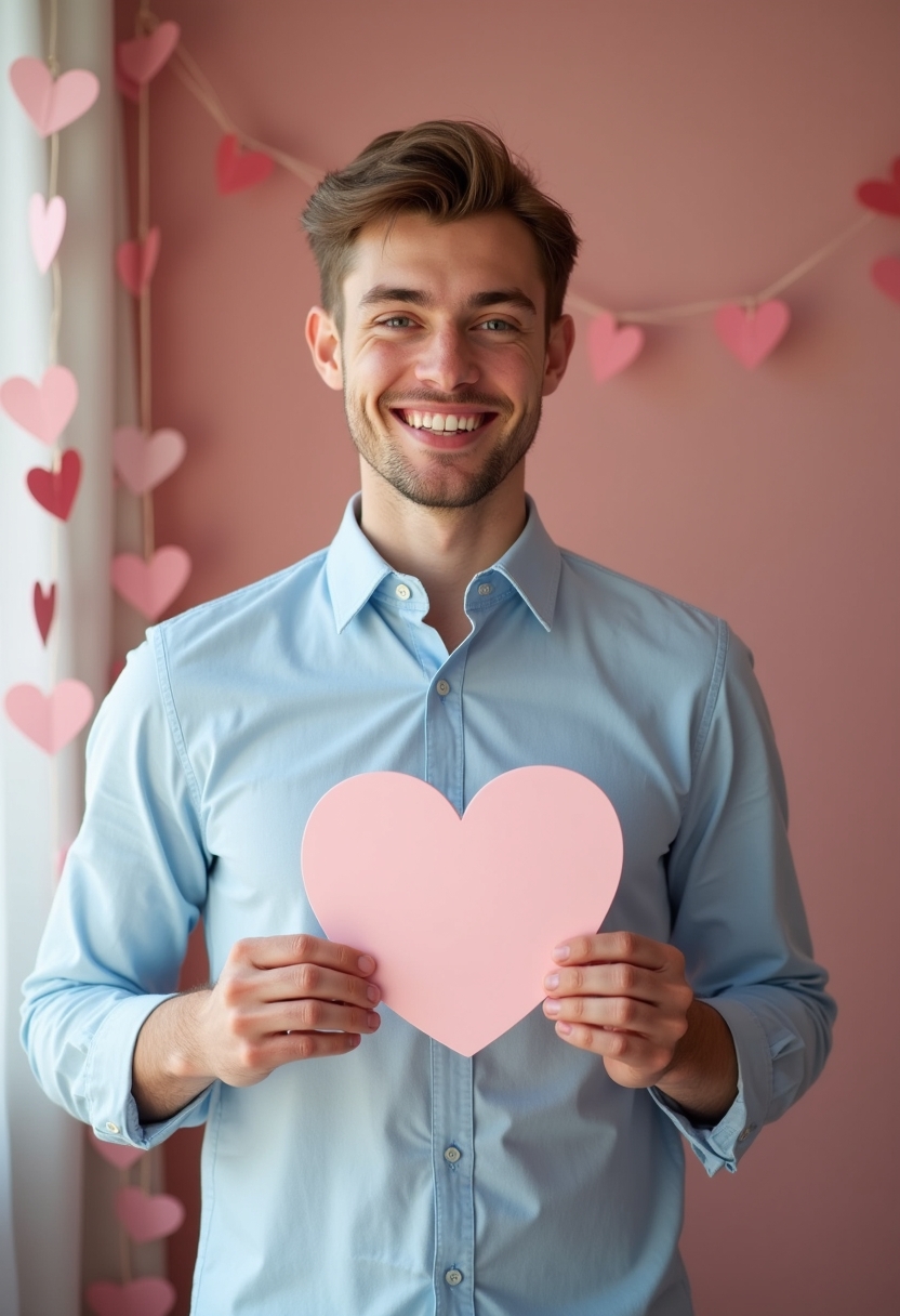 Мужчина в светло-голубой рубашке стоит у стены, украшенной гирляндой из сердечек. Он держит в руках большую открытку в форме сердца и смотрит прямо в камеру с радостной улыбкой. Освещение яркое, акцент на его открытости.