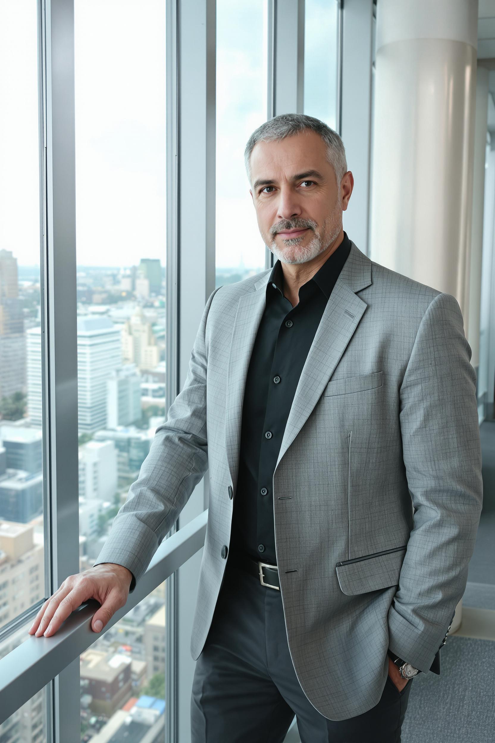 Мужчина средних лет в светло-графитовом костюме без лишних деталей, под пиджаком однотонная чёрная рубашка, стоит у стеклянной стены офисного этажа с видом на город, опирается одной рукой на перила, средний план, прямой деловой взгляд в камеру, минимализм.