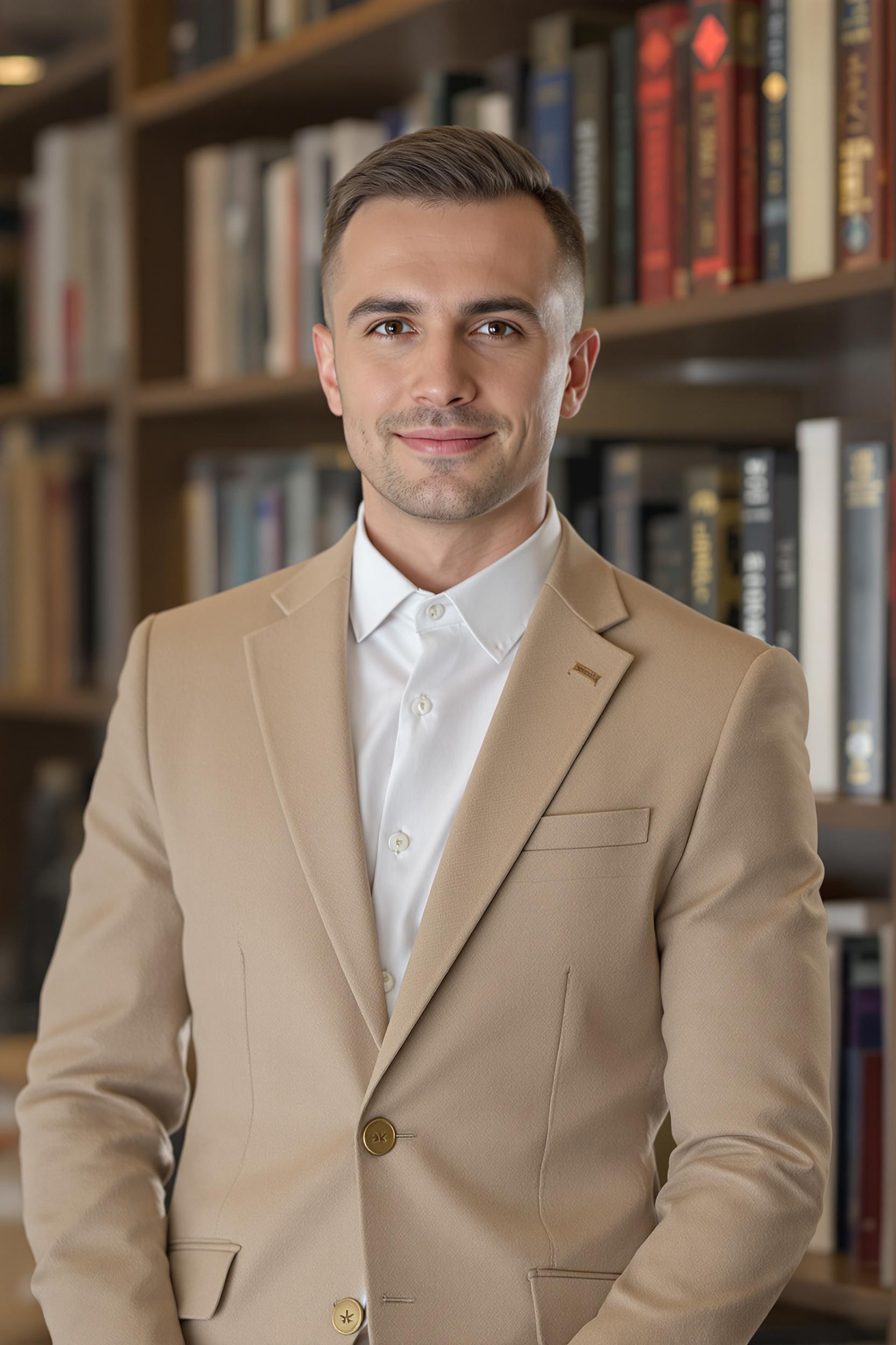 Мужчина в светло-коричневом деловом костюме и белой рубашке, аккуратная стрижка, лёгкая улыбка. Крупный план лица и плеч на фоне книжных полок современного офиса, мягкое рассеянное освещение, уверенный взгляд прямо в камеру.