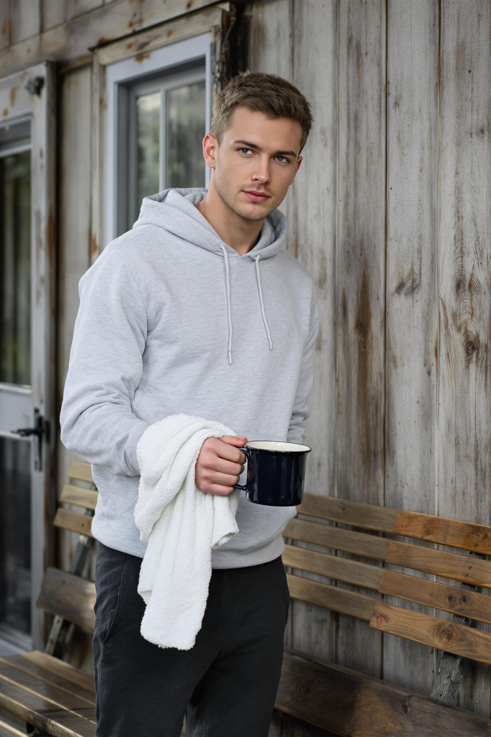 Мужчина в светло-сером хлопковом худи и тёмных спортивных штанах стоит у деревянной лавки возле стены дачного дома, протирает большую эмалированную кружку полотенцем, внимательно смотрит прямо в камеру. Спокойная дачная атмосфера.