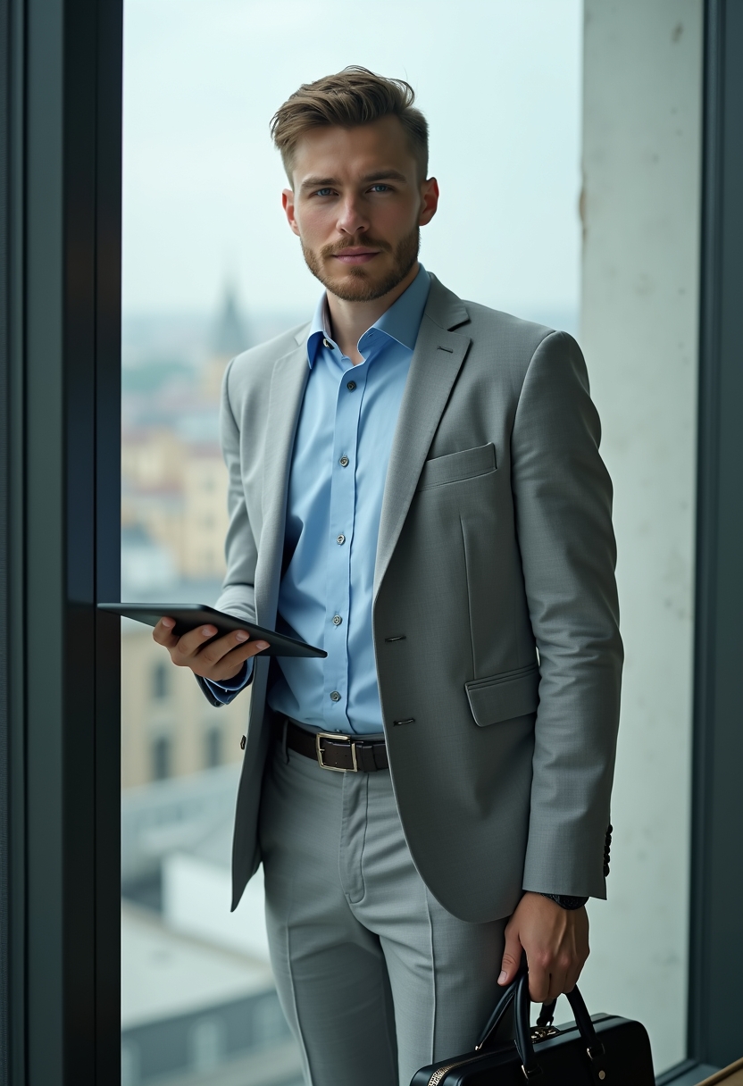 Мужчина в светло-сером костюме и голубой рубашке стоит у окна с планшетом и деловой сумкой. Он смотрит в камеру с лёгкой полуулыбкой, позади городские виды. Крупный план.
